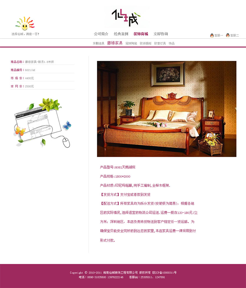 2011年为海南仙城装饰工程有限公司提供了企业网站建设服务,网站目的主要是为了介绍公司业务以及通过装修案例展示装修实力外,还提供了装修周边包括家具在内的商品展示。网站开发采用Asp+Access ,网站设计采用紫色背景风格,结合绿色的LOGO,配合装修图片显得相得益彰。